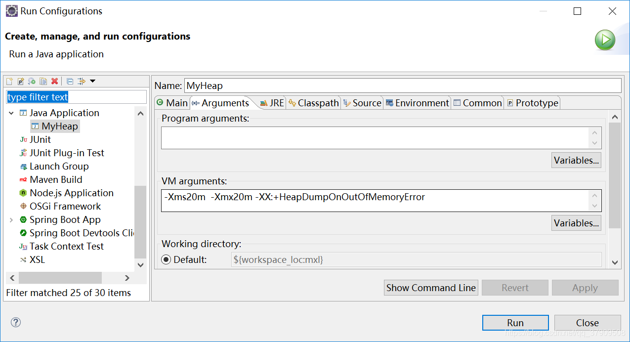 修改JVM参数:-Xms20m -Xmx20m -XX:+HeapDumpOnOutOfMemoryError