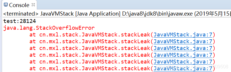 package cn.mxl.stack;public class JavaVMStack { private int test=1; public void stackLeak() { test++; stackLeak(); } public static void main(String[] args) { // TODO Auto-generated method stub JavaVMStack javaVMStack=new JavaVMStack(); try { javaVMStack.stackLeak(); } catch (Throwable e) { // TODO: handle exception System.out.println("test:"+javaVMStack.test); e.printStackTrace(); } }} 运行结果: